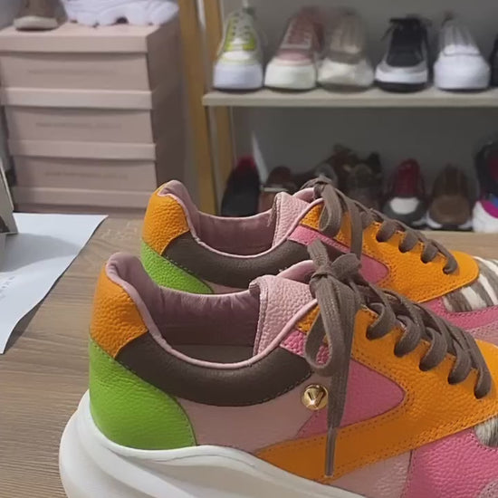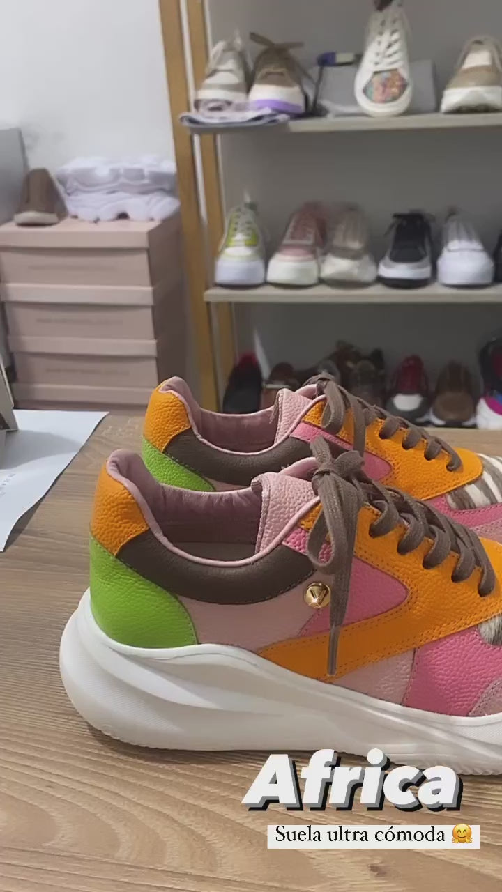 ¡La belleza de la autenticidad! AFRICA es una zapatilla en cuero color coral con pop naranja, verde y suela liviana tipo EVA.